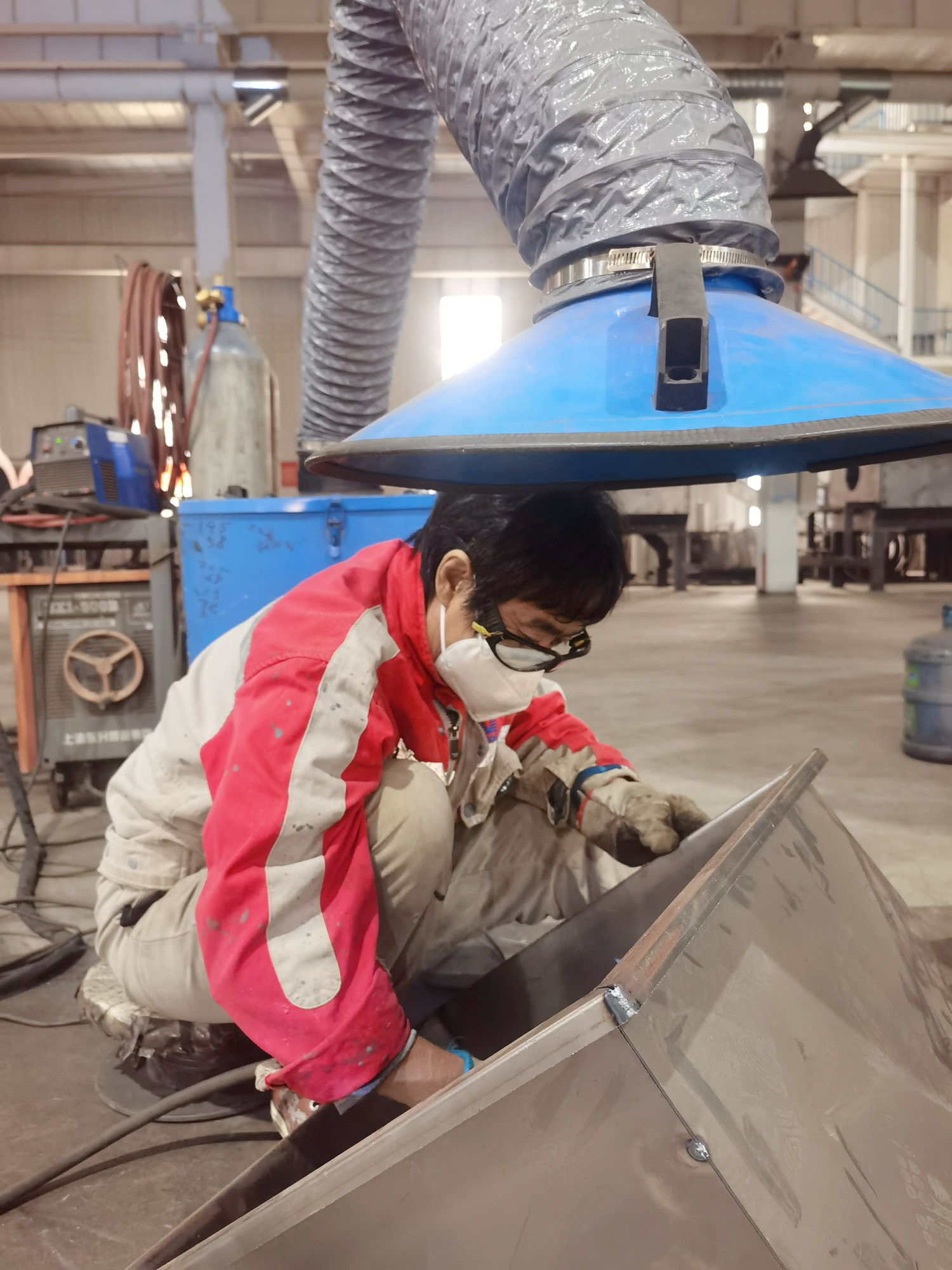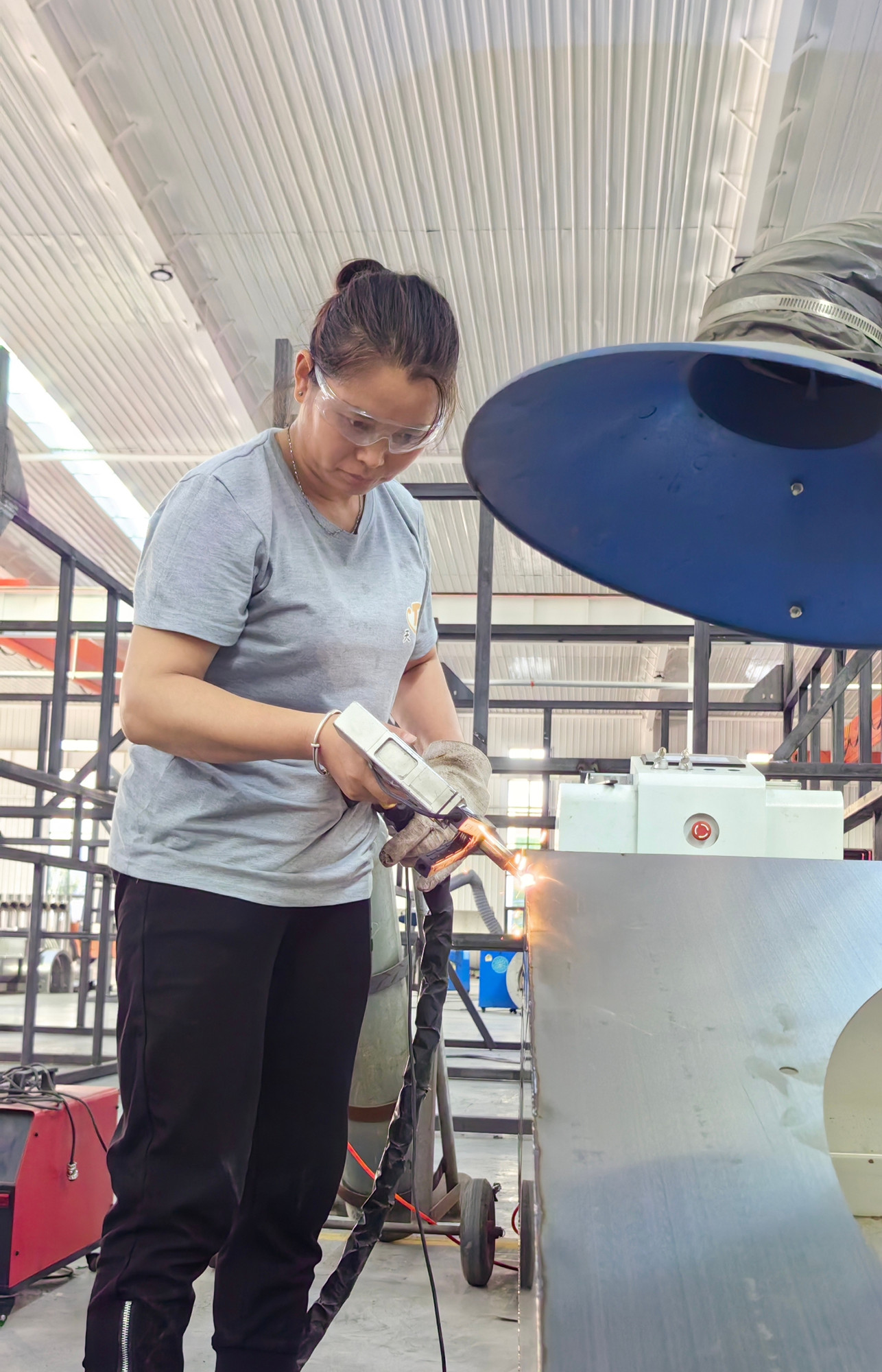 “有人覺得這是男人干的活兒。但女工師傅絲毫不輸男職工。焊機轟鳴,焊花飛濺,光影交織中映襯出一派火熱的作業現場,電焊面罩下是被熱浪灼紅的皮膚,我們一線