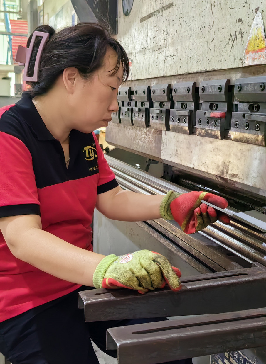 車間的女工張花果師傅、鄧立坤師傅除了熟悉作業的壁厚、角度,有時還要一直保持蹲姿、站姿干活兒,這在她們身上是常有的事,但她們沒有一個人退縮。深入車間,折彎的女工趙云平師傅正在認真的作業,折彎需要一定的專業技術,更需要強大的專注力,在悶熱的車間里,她依然拿出十二分的狀態來對待工作。